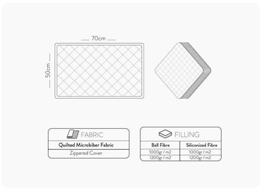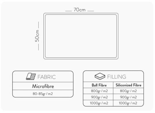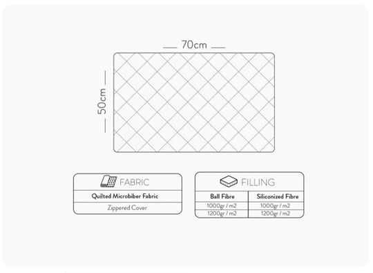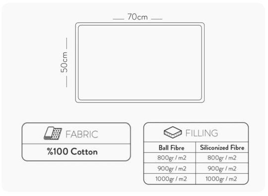 Yumuşak ve dolgun yapısı, %100 doğal pamuk kumaşı ile ısı dengenizi korur bu sayede yaz-kış uykunuza konfor katar. Teknik Özellikler İç Dolgu Malzemesi : Kalite Yerli Pamuk Kumaş Özelliği: 72 Tel %100 Pamuk Ebat: 50 x 70 cm Ağırlık: 1000 gr ± 25 gr. Kuru temizleme yapılabilir. Elde ve çamaşır makinesinde 30 C’de yıkanabilir.