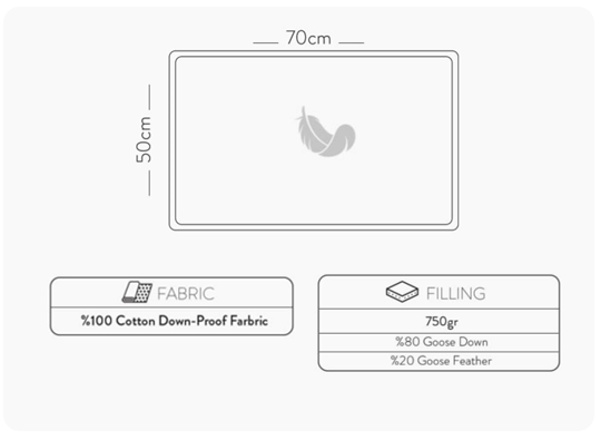 Yüksek kaliteli kaz tüyünün yumuşacık ve hafif yapısı sıcacık ve konforlu bir uyku keyfi yaşamanıza yardımcı olurken, özel kumaşının eşsiz ve ferah dokusu ile bulutların üzerindeymişçesine rahat bir uyku keyfi yaşatır. Teknik Özellikler İç Dolgu Malzemesi: 1. Kalite Yerli Kaz Tüyü %10 Gıdı, %90 Sırt Kumaş Özelliği: 82 Tel Pamuklu Saten Ebat: 50 x 70 cm Ağırlık: 1100 gr ± 25 gr. Kuru temizleme yapılabilir. Elde ve çamaşır makinesinde 30 C’de yıkanabilir.