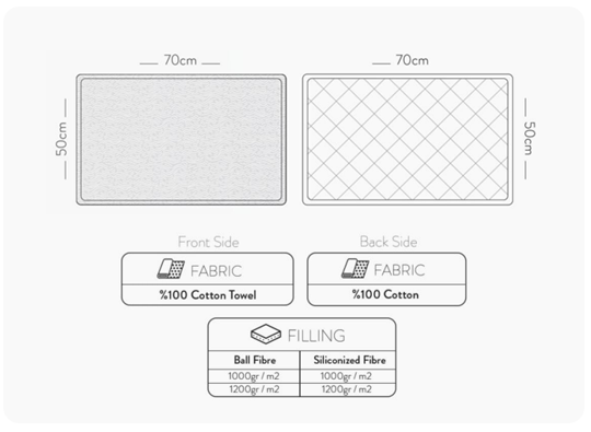Pamuktan ve havludan oluşan çift taraflı yüzeyi sayesinde gece boyU kesintisiz bir uyku keyfi yaşamanıza yardımcı olur. Havlulu tarafı teri emer ve sıcak tutarken, pamuklu yüzeyi vücut ısınızı dengeler, siz uyurken cildinizin nefes almasını sağlar. Kumaş : Ön Taraf: %100 Pamuk Havlu Arka Taraf: %100 Pamuk Dolgu : Ball Fiber – Siliconized Fiber 1000/1200 gr/m2